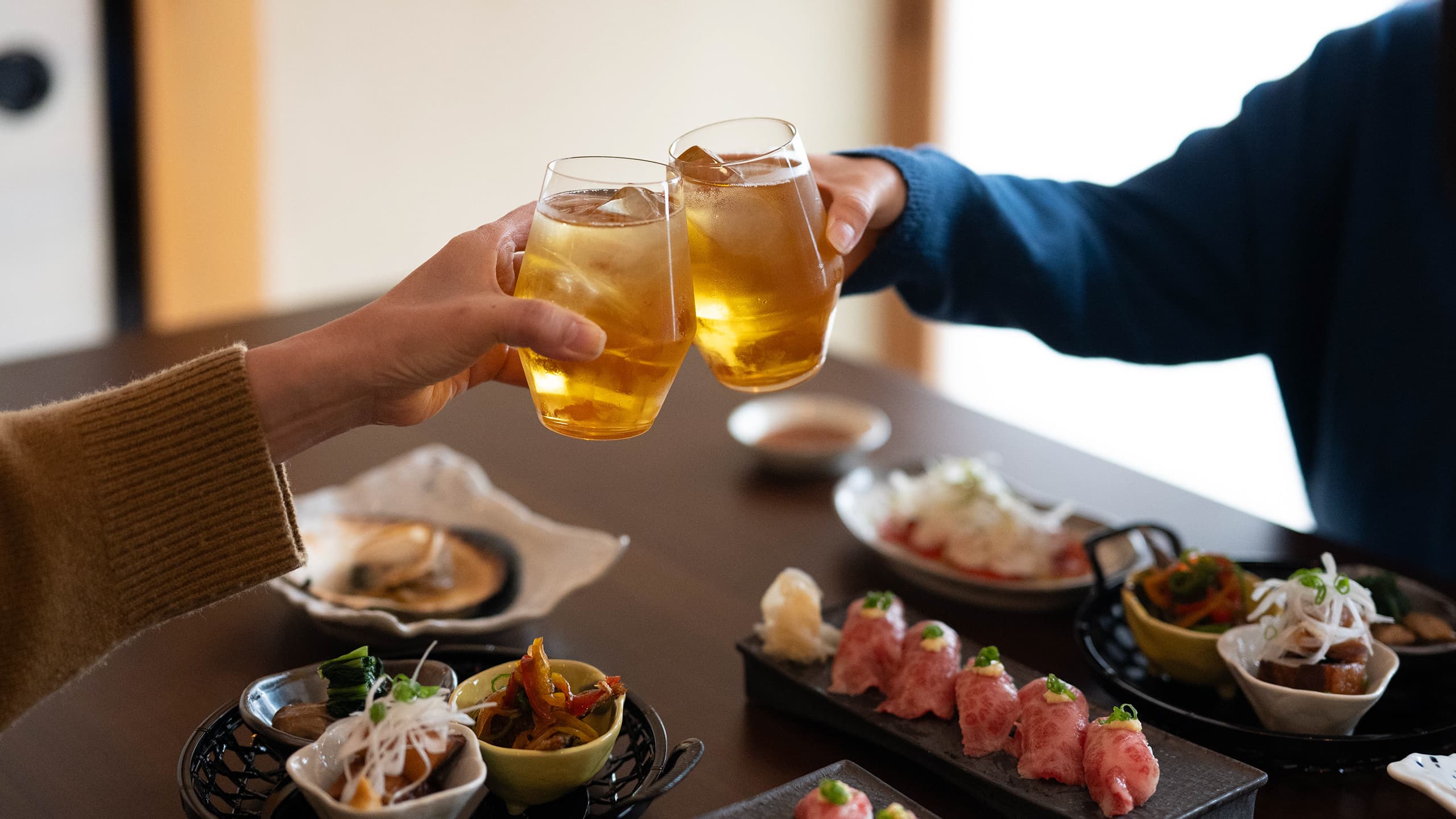 夕方にはサウナで体を温め、地元の旬の食材とお酒で乾杯